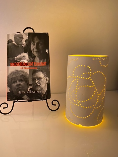 Tutustuin rikoskirjailijoista kertovaan mielenkiintoiseen artikkelikokoelmaan. Kokoelman kirjoittaja, helsinkiläinen Heikki Ollikainen (1950 – ) on koulutukseltaan yhteiskuntatieteiden lisensiaatti. Ennen eläköitymistään Ollikainen toimi päihdealan tiedottajana ja sitä ennen kirjasto- ja mainosalalla. Harrastuksenaan hän on toiminut Ruumiin kulttuurin avustajana. Hän on haastatellut rikoskirjailijoita vuodesta 2007 lähtien, ja nyt haastattelut on koottu yksiin kansiin.