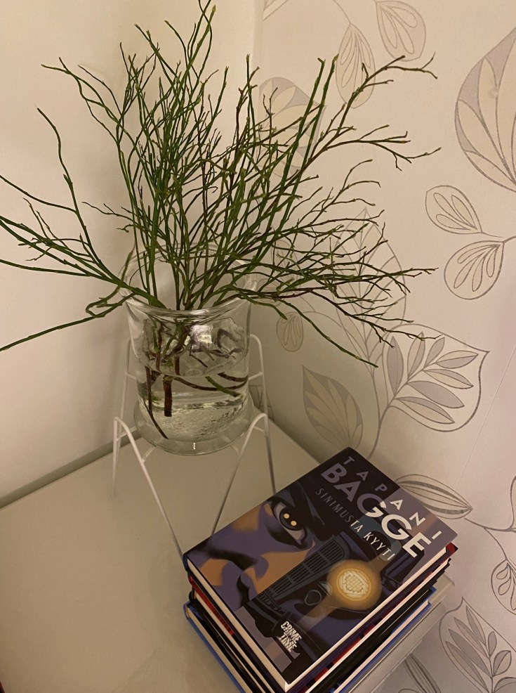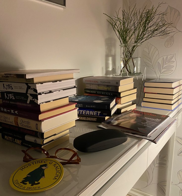 Kuten minulla on tapana, säädän haastetta vähän. Sijoitan nimittäin lukemattomat kirjat yöpöydälle ja luetut hyllyyn. Yöpöydän kasvava pino johti toissa talvena siihen, että hankin suuremman yöpöydän. Voi pitää useampaa pinoa. Niitä vajutan nyt.